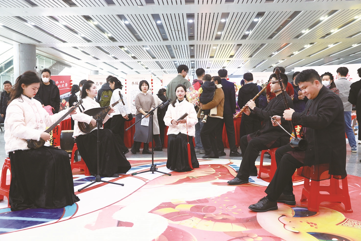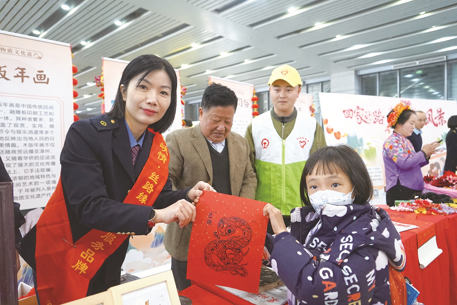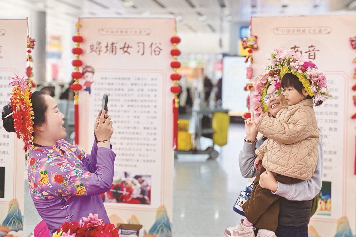 上午9点多,泉州火车站候车厅响起了阵阵鼓声,随后高甲戏、木偶戏、南音也轮番上演,原本正在候车的旅客们都自发地围了过来,驻足欣赏、拍照。一旁的簪花、木版年画等国家级非遗代表性项目的摊位前,也吸引了不少前来体验的旅客朋友。随着人流量的增加,头戴簪花的旅客朋友们越来越多,与候车厅挂满的泉州花灯交相辉映,为车站增添了一抹浓厚的喜庆色彩,满满的年味扑面而来。
