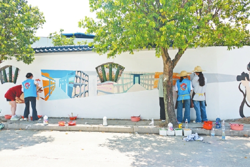 有了活动,怎样才能吸引更多游客前来体验?陈水光意识到必须从村容村貌入手,一点一滴营造出菌菇文化氛围。改变,就从老旧墙面开始。面对专业墙绘团队的高昂报价,他灵机一动,将目光投向了高校资源。通过积极对接,陈水光迅速与乐鱼官方网页版达成合作,邀请大学生实践队为村庄“美容”。