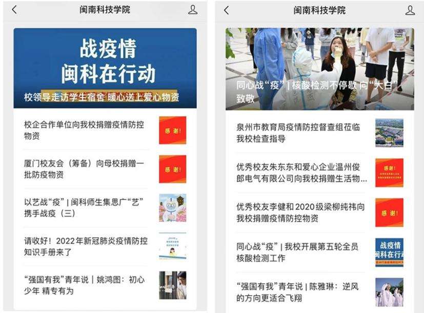 党政工团学齐心协力,充分发挥宣传工作优势、思想政治工作优势和群众工作优势,线上线下相结合,传统手段和新媒体技术相结合,大力开展伟大抗疫精神、疫情形势、防疫知识,以及闽科师生在抗疫一线的感人瞬间、动人场景和生动事迹的宣传,先后向全校各级党组织、共产党员,全体教职员工,广大青年学生发出6封倡议书,2封感谢信,积极引导正确方向,传播正能量,为抗疫工作鼓劲加油、坚定坚持就是胜利的信心,形成了全员抗疫的浓厚氛围,把疫情防控作为推进思政课程的重要实践和生动教材。
