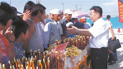 福建农林大学林占熺研究员在宁夏银川永宁县闽宁镇向农户介绍菌草技术。罗彪远摄(资料图片)