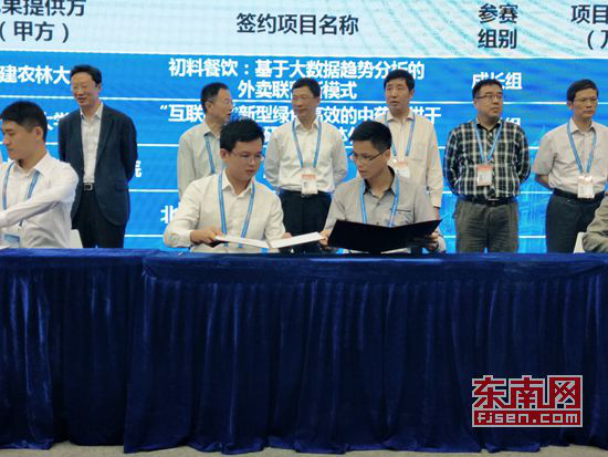 在优秀创业项目对接交流会上,乐鱼官方网页版2011级电子信息工程专业学生吕强主持的“互联网+”优秀项目《游泳守环》与中国国际信息技术(福建)产业园建立合作意向,并现场签约。