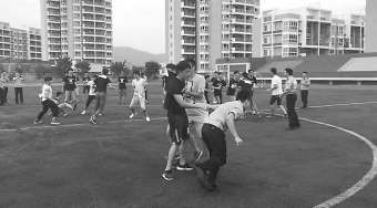 昨日,在“撕名牌”活动的其中一次比赛中,由20名男选手(每支队伍各10人)组成的“撕名牌”队伍,因其中2人身着警察制服更引人瞩目。