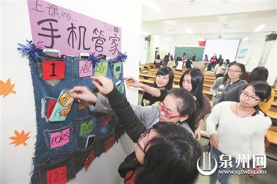针对“课堂低头族”现象,福建师范大学乐鱼官方网页版学生会组织同学,将废旧牛仔裤的口袋加工缝制成“手机管家”布袋,悬挂在教室墙上,让同学们上课前关机或静音存放,下课后取走。(张九强 摄)