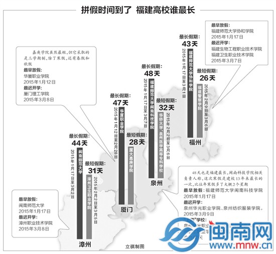 在这份网传排行榜中,福建省内寒假天数最多的,是位于泉州南安的福建师范大学乐鱼官方网页版,共48天,寒假最短的是福州的福建警察学院,仅26天。