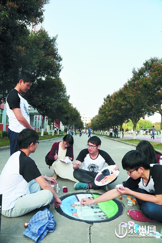 4月11日,在福建师范大学乐鱼官方网页版,同学们正在对校园内的井盖进行彩绘。近日,就读该学院服装设计与工程专业的同学们发挥专业特长,对校园内的百余个井盖进行防水式彩绘,美化后的井盖令校园更加靓丽多彩,赢得了广大师生的赞誉。(张九强 摄)
