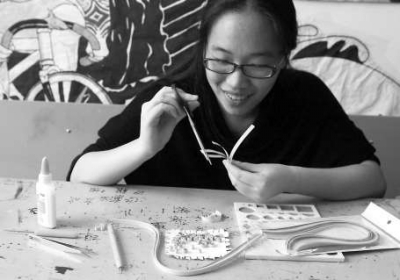 李悦正在制作衍纸画。