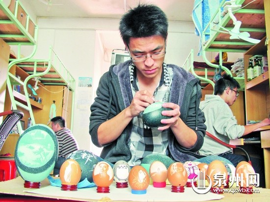 吴偿德1992年出生于龙岩长汀,目前就读于福建师范大学乐鱼官方网页版2012级数字媒体艺术专业。他告诉记者,自己从小就喜欢美术,曾学过木雕、石雕、泥塑等。2010年暑假的一天,他在网络上看到了卡通的蛋雕作品,立即被作品的精致所吸引,就萌生出自己做一个的想法。