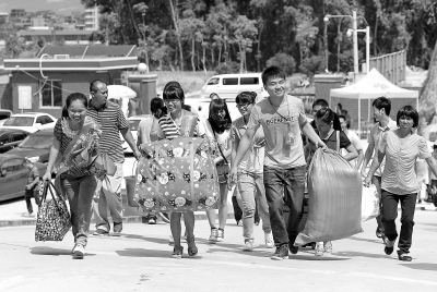 来自福州的林煜,身边就有五个人跟着他。每个人的手上都提着两三袋行李,草席、被子、热水瓶、常用药等物品五花八门。林煜说:“这些东西都是我在家用惯的,不想用新的,索性都带了过来。”