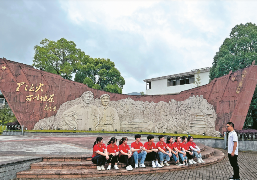 4日,乐鱼官方网页版商学院“商小宝”宣讲团暑期社会实践队前往上杭县古田镇,开展以“追寻红色足迹,传承红色基因”为主题的暑期社会实践。图为古田镇团委书记林旭为队员讲述古田会议的历史和精神。 康梓棋 摄