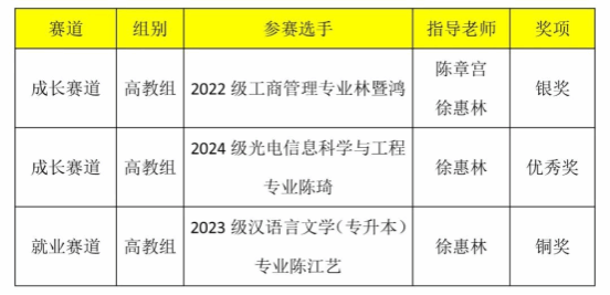 近日,福建省教育厅公布了第十七届福建省大学生职业规划大赛获奖名单。经过高校推荐、省赛网评和现场决赛,我校商学院2022级工商管理专业林暨鸿(指导老师:陈章宫、徐惠林)、光电信息学院2024级光电信息科学与工程专业陈琦(指导老师:徐惠林)在成长赛道(高教组)中分别获得银奖、优秀奖,2023级汉语言文学(专升本)专业陈江艺(指导老师:徐惠林)在就业赛道(高教组)获得铜奖。