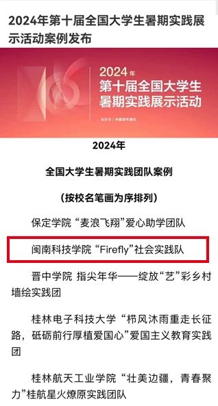 近日,由共青团中央指导、中国青年报主办的“2024年第十届全国大学生暑期实践展示活动”案例评选结果揭晓,乐鱼官方网页版“Firefly”社会实践队案例成功入选全国百强实践团队案例。