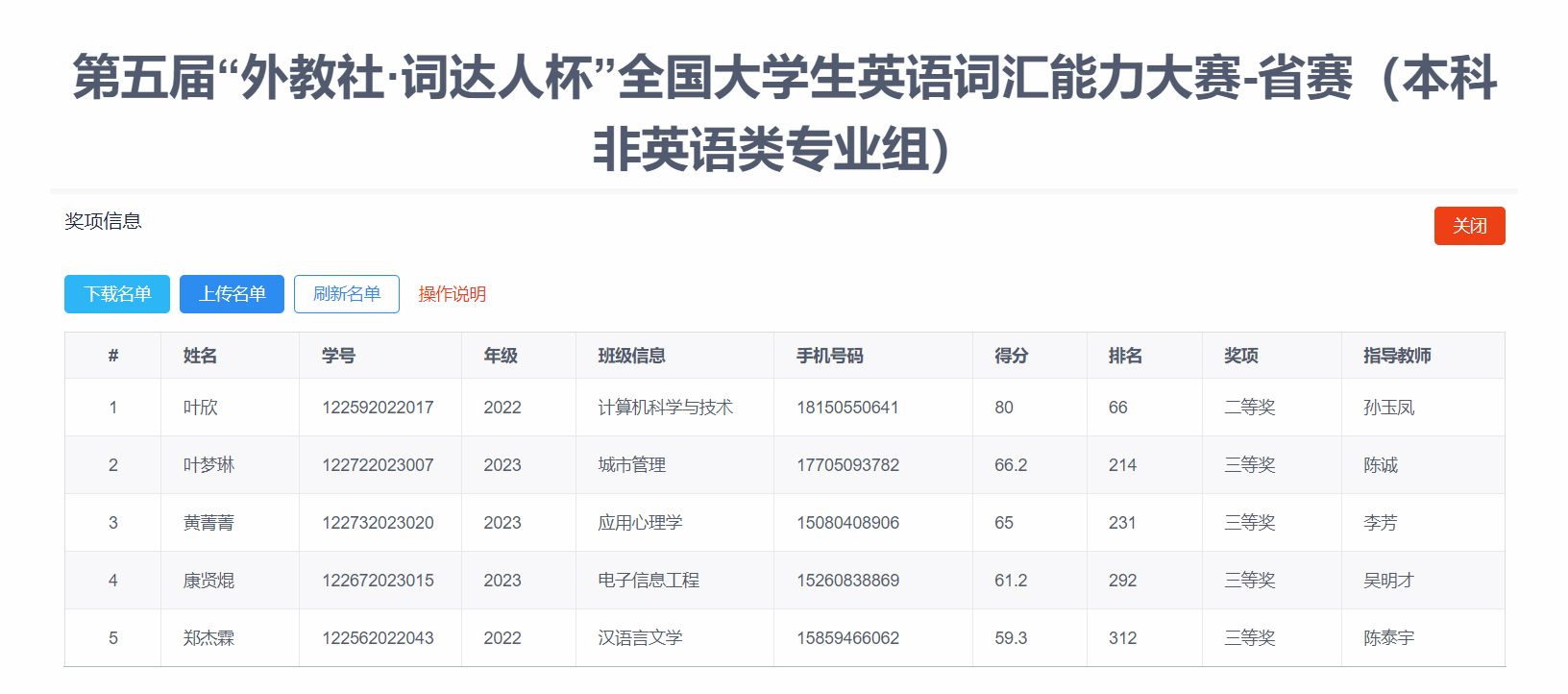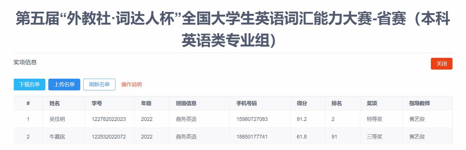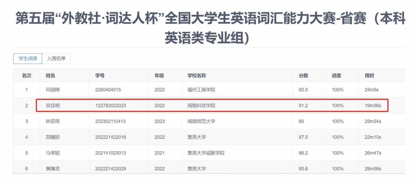 本次比赛吸引了来自全省众多高校的学生参与,竞争异常激烈,比赛题型丰富多样,涵盖各大题型,全面考察选手的英语词汇理解与应用能力。比赛中,人文学院2022级商务英语的吴佳明同学凭借扎实的词汇功底和出色的临场发挥,以全省第二名(特等奖)的优异成绩成功晋级国赛,展现了我校学子在英语学习方面的卓越风采,彰显了我校在人才培养方面的育人成效。