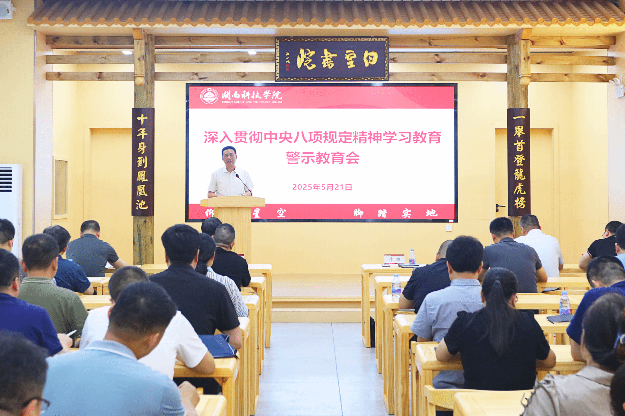 5月21日下午,我校召开深入贯彻中央八项规定精神学习教育警示教育会,校党委书记李旭做总结讲话,校纪委书记周勇军做案例警示教育,校领导袁自煌、林树生、刘武强,校党委委员,校纪委委员,全体中层干部,院长助理,二级党组织专职组织员、纪检委员参加会议。校党委副书记林树生主持会议。