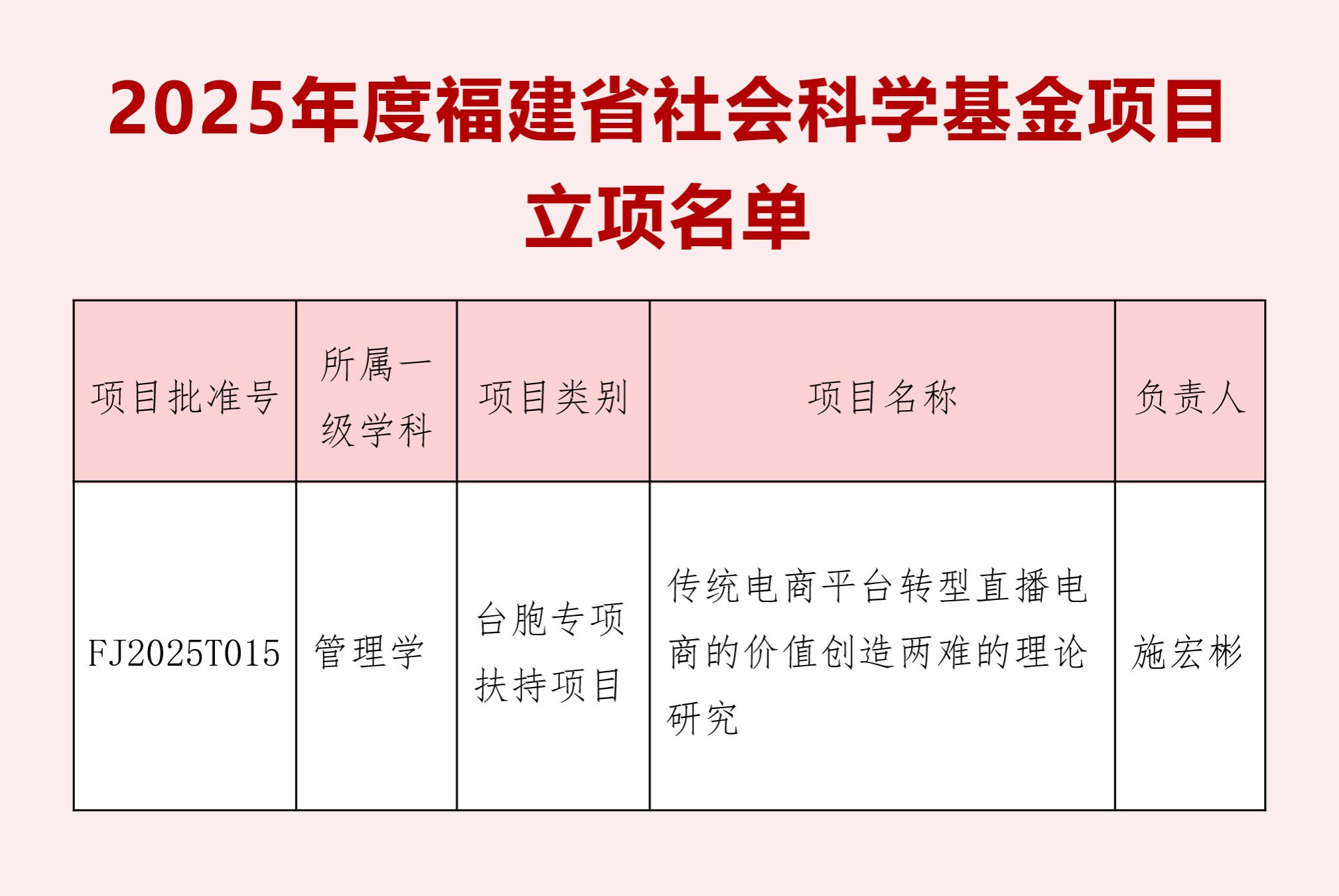 近日,福建省社会科学规划办公室公布了2025年度福建省社会科学基金项目立项名单,我校商学院施宏彬教授的《传统电商平台转型直播电商的价值创造两难的理论研究》成功获批台胞专项扶持项目立项。