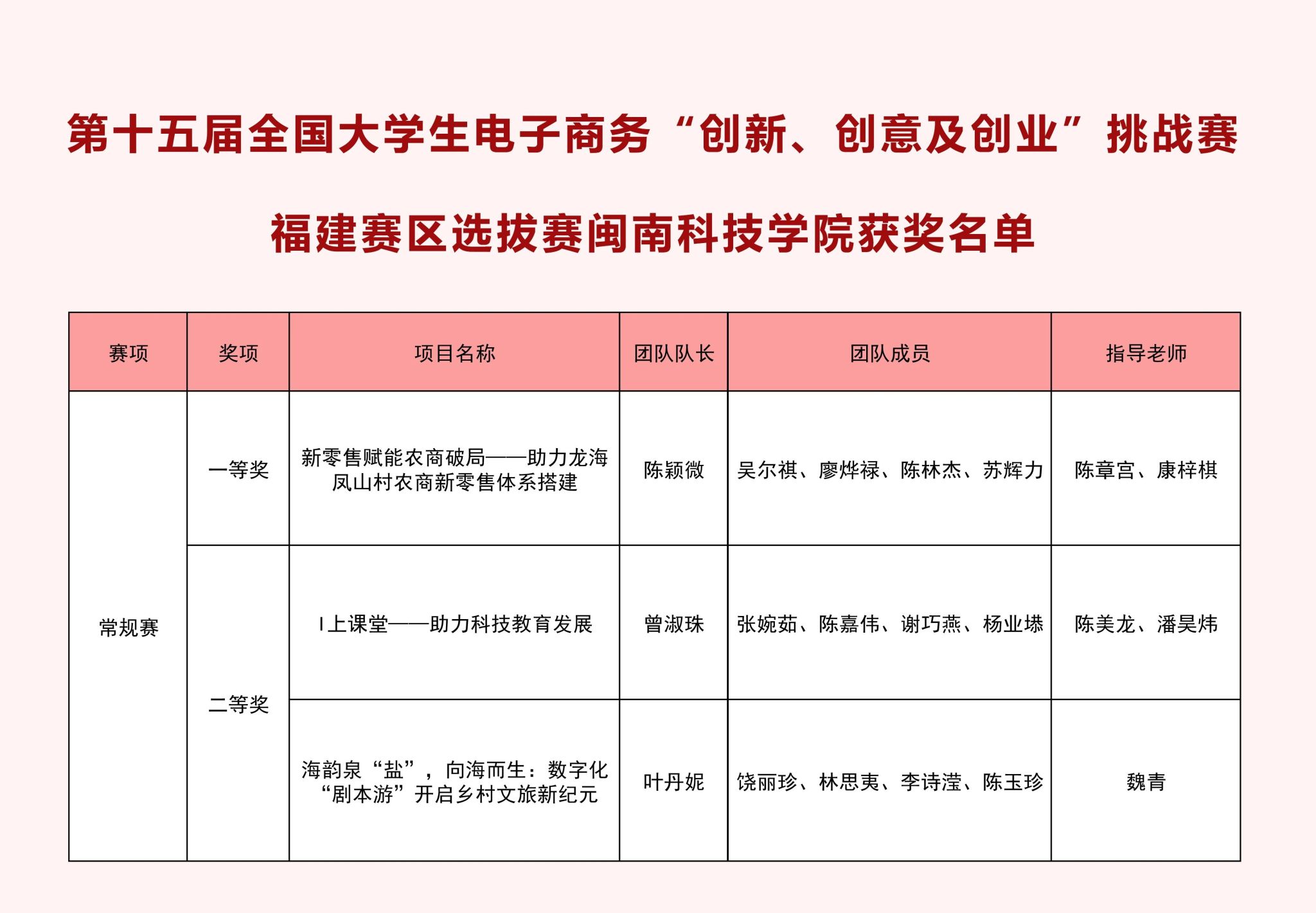 近日,第十五届全国大学生电子商务“创新、创意及创业”挑战赛福建赛区选拔赛获奖结果公布,经过激烈角逐,我校获常规赛一等奖1项、二等奖2项;陈章宫、康梓棋两位老师获优秀指导老师奖。