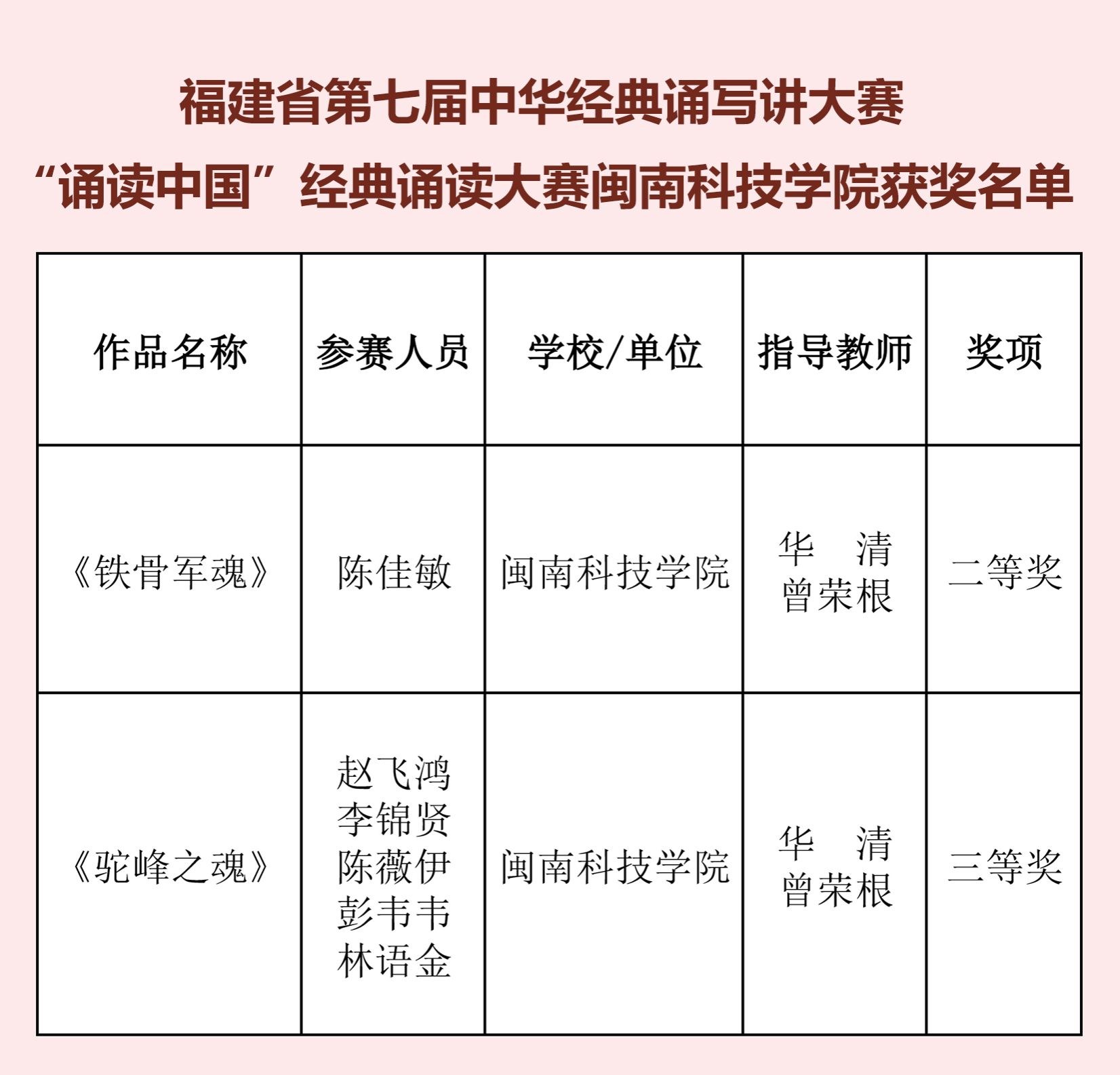近日,福建省教育厅、福建省语言文字工作委员会联合公布福建省第七届中华经典诵写讲大赛获奖名单,我校学子在“诵读中国”经典诵读大赛中获二等奖1项,三等奖1项。