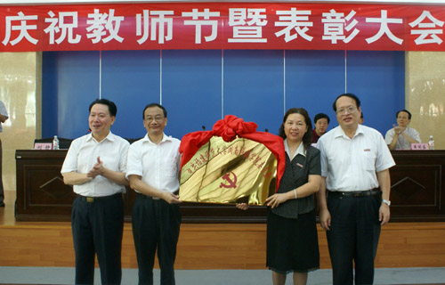 福建师范大学党委书记张金栋(左一)和校长李建平(右一)为学院委员会授牌
