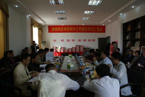 会上,林国庆同志代表学院董事会及学院党政向检查组作题为《明确目标扎实工作 突出特色 共创和谐》的精神文明建设工作汇报。分别从组织领导、思想道德建设、校风、教风及学风、校园文化、校园环境、安全稳定、工作特色等七个方面对学院2009-2010学年的精神文明建设工作进行了认真的总结。重点汇报了学院注重特色和品牌建设,努力创建优良的校风、教风、学风,不断提高以良好的校园秩序和优美的校园环境为主要标志的校园文明程度,学院已逐步形成教学、科研、产学研开发与思想道德文化建设协调发展的良好局面。院长郭丹教授、副院长肖华山教授就我院精神文明建设工作的特点和优势,向检查组做了补充汇报。