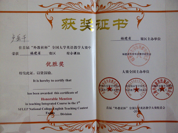 首届“外教社杯”全国大学英语教学大赛福建赛区决赛于5月22-23日在福建师范大学举行,我院外语外贸系卢岳千老师在淘汰赛中成功突围,与来自福建省二十几所高等院校的优秀选手参加决赛的角逐,并获得了综合组优胜奖。