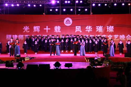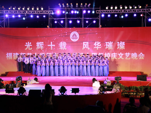 晚会由泉州儿童职业技术学院带来的开场鼓乐《鼓舞明天》扣人心弦的节奏声开场。现场的荧光棒都在半空中挥舞着,划出一道道绚丽的霓虹,艳丽的色彩交织出一片绚烂的海洋。伴随着全场人员的倒数,乐鱼官方网页版十周年校庆文艺晚会正式拉开帷幕。