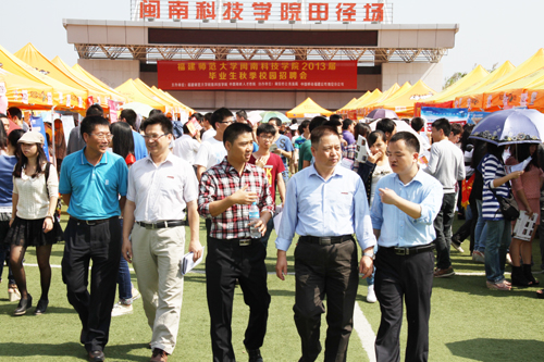 10月25日,我院2013届毕业生秋季校园招聘会在我院田径场举行。招聘会由中国海峡人才市场和我院共同主办,南安市公务员局和中国移动福建公司南安分公司协办。来自福州、厦门、泉州、莆田等地区近250家企业参加招聘会,其中梅花伞业、鸿星尔克、达利集团、中宇集团、雪花啤酒、爱登堡、富贵鸟、七匹狼等众多知名单位参会,提供各类岗位5000多个。南安市公务员局副局长陈光明、学院党委常务副书记林明旭、党委副书记李彬源等深入招聘会现场,亲切看望了招聘单位人员,关切询问了毕业生的就业情况。