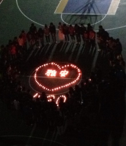 4月21日,我院100多名学子自发聚集在篮球场上,摆下蜡烛,一起为四川地震灾区的雅安人民祈福。