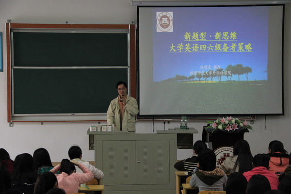 11月21日,“闽科讲坛”邀请福建师范大学外语教学部主任林明金教授在菲华教学楼c#102作了题为“新题型·新思维—大学英语四六级备考策略”的讲座。讲座由我院外语系常务副主任孙文缘主持。