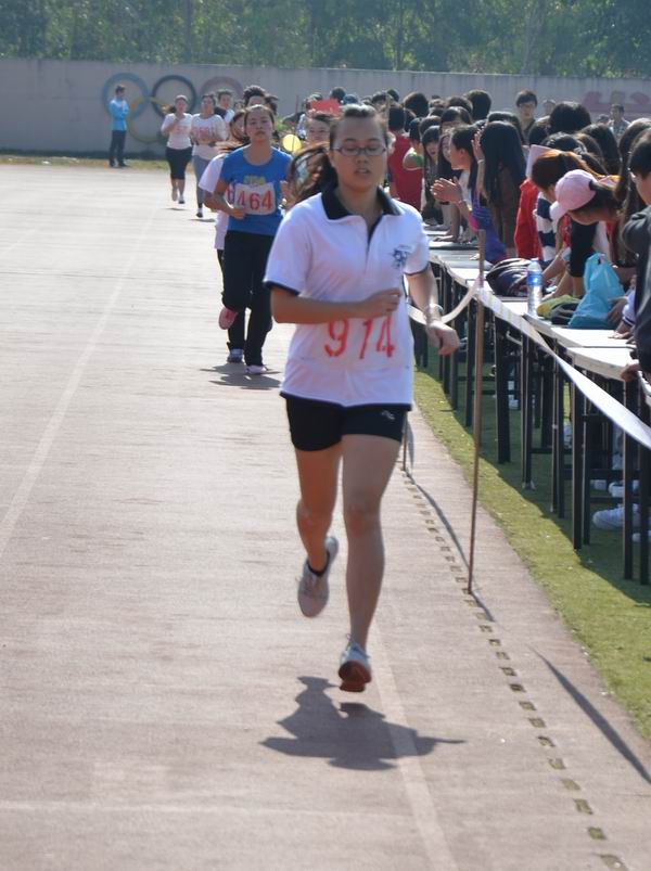 运动会第二天,9点50分,女子1500米长跑赛道上,响起了激动人心的起跑枪声,令人瞩目的时刻带来了许多温暖人心的感动。在人海中,一位耀眼夺目的选手,她目视前方,冲在跑道最前方;她的四肢在不断地交换着风般的频率,马尾辫伴随着节奏在风中甩起;她的白色衬衫上贴着鲜红的三个大字914——她,就是来自2012级城市管理专业的戴丽春同学,凭借着6分13秒37的成绩在该项目夺得亚军。在随后的采访中记者了解到,戴丽春同学平常是特别爱好运动的。从初一开始她就一直参加长跑的比赛,到了现在整整7年。她说,“我很享受在赛场上奔跑的感觉,同学们的加油声让我非常感动。我要通过速度来回报他们”。