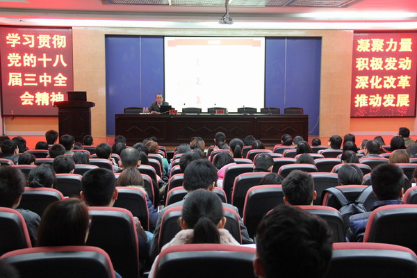 郭春芳教授从“全面深化改革的重大战略意义”、“全面深化改革的总体战略思考”、“全面深化改革的总体战略部署”、“确保全面深化改革取得圆满成功”等方面,全面系统阐述了党的十八届三中全会的主要精神。宣讲报告针对社会热点难点,结合民生关注,将党的十八届三中全会精神剖析透彻、解读深刻,让在场师生深受启发、教育和鼓舞,引起热烈反响。