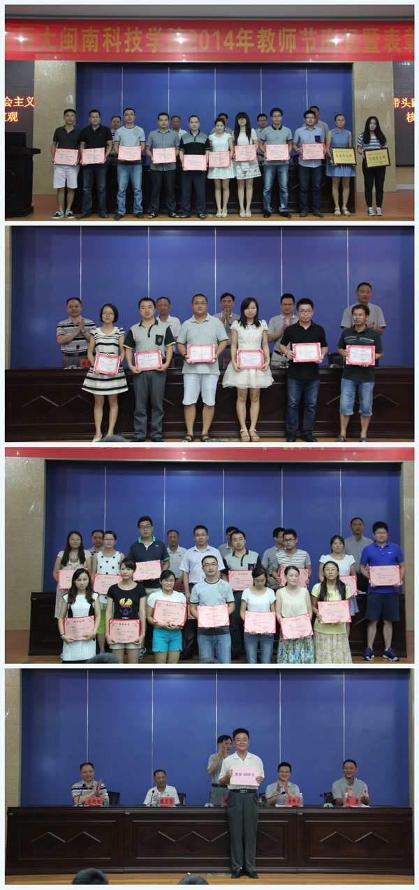 党委副书记李彬源宣读了《福建师范大学乐鱼官方网页版2013-2014学年获得各级各类荣誉称号的先进集体和先进个人名单》。副院长吴勇宣读了《福建师范大学乐鱼官方网页版2014年教师节教育教学先进单位和个人表彰决定》。全体与会领导为获奖的先进集体和先进个人颁奖。