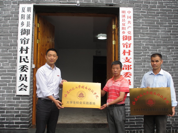 5月22日,我院与明溪县夏阳乡御帘村举行共建大学生思想政治教育社会实践基地和大学生社会实践基地授牌仪式,授牌仪式在御帘村村委会举行。夏阳乡党委书记李毅,学院副院长吴勇、学工部部长林树生、思想政治教研部主任郭伟、团委副书记庄天怀,我院挂职团干、明溪团县委副书记陈章宫,以及御帘村两委干部参加了授牌仪式。