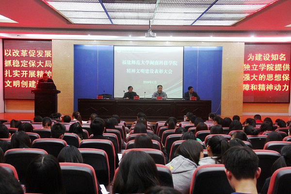 会上,院党委常务副书记林明旭作重要讲话。他指出,过去的两年,院党委在福建师大党委的正确领导下,紧紧围绕学院中心工作、以改革促发展,抓稳定保大局,制定出台了《中共福建师范大学乐鱼官方网页版委员会关于进一步加强精神文明建设工作的意见》和《福建师范大学乐鱼官方网页版精神文明建设评选管理办法(试行)》,扎实开展精神文明创建活动,取得了明显成效。一是围绕健全制度,扎实推进思想理论建设,社会主义核心价值观深入人心;二是围绕文化建设,深化创建活动,校园文明程度持续提升;三是围绕服务社会功能,加强文明共建,推动精神文明建设成果的对外辐射。林明旭强调,精神文明建设工作要常抓不懈,要继续围绕学院的工作中心,从形象建设到内涵建设,从制度建设到自觉实践,不断提升精神文明的总体水平和质量,全力推进学院各项工作再上新台阶。一要促进改革,不断完善学院精神文明创建的长效机制;二要加强宣传,着力打造学院精神文明创建的特色和品牌;三要深化成果,构建社会主义核心价值观传播体系,不断开创学院精神文明建设新局面,为建设知名独立学院提供强大的思想保障和精神动力。