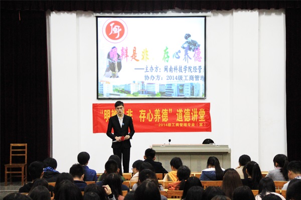20日, 2014级工商管理专业举办“明辨是非,存心养德”主题道德讲堂活动。活动分为“观一段视频”、“知一门学问”、“输一条微博”、“讲一个故事”、“赏一则小品”、“谈一个感受”六个环节。在“谈一个感受”环节中,同学们各抒己见,纷纷表达崇德向善、知理尚义的行为观念,来自2015级工商管理专业张嘉诚同学说:“用明亮的双眼明辨是与非,存一颗善心养一份恩德。”2014级工商管理专业辅导员黄少阳在活动总结中表示,“明辨是非,存心养德”是当代大学生应当具备的基本品质,希望同学们见贤思齐,择善而从,不断提升道德素养,用正能量去感染身边的人,成为道德的传播者、实践者和受益者。