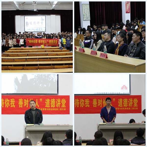 12月6日晚,经济管理系2014级信息管理与信息系统专业第二团支部举办“诚待你我,善对他人”主题道德讲堂活动。活动围绕“述一个道理”、“观一部短片”、“ 讲一段故事”、“唱一首歌”、“发一条微博”、“宣一则期望”、“听一番感悟”、“签一个名字”八个环节展开。