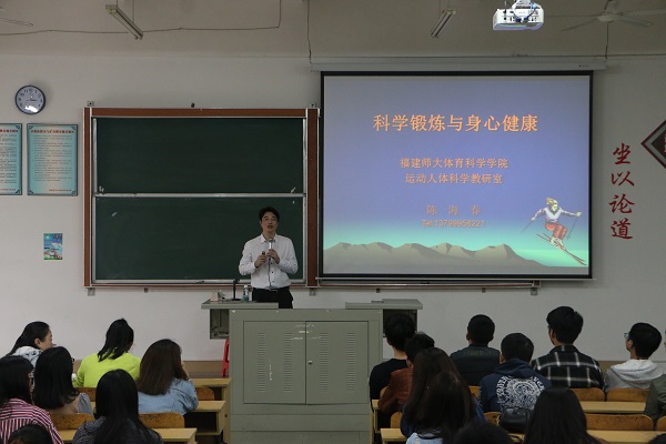 4月12日,“闽科讲坛”邀请福建师范大学体育科学学院教授、博导陈海春作题为“科学锻炼与身心健康”的讲座。讲座由学院副院长吴勇主持。