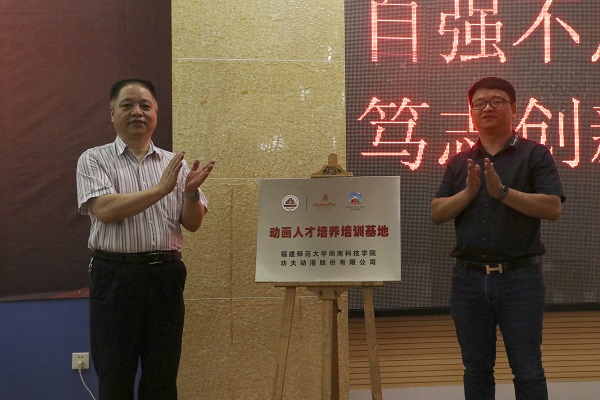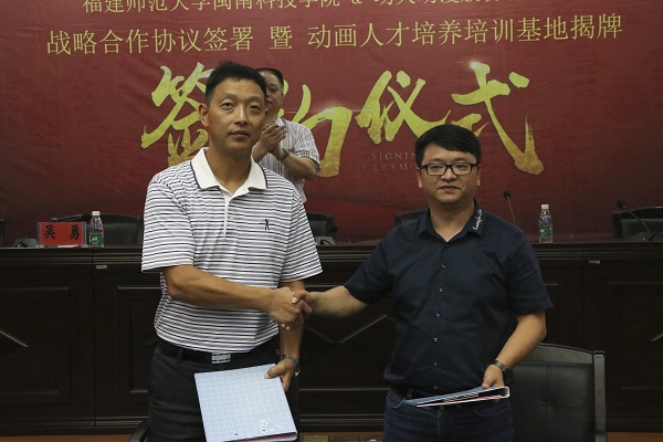 9月27日,我院与泉州功夫动漫设计有限公司举行战略合作协议签署暨动画人才培养基地揭牌仪式。泉州市功夫动漫设计有限公司董事长李竹兵、动漫学院总经理林燕、技术总监姚一楠,院领导林明旭、吴勇出席仪式。仪式由计算机科学系副主任张剑锋副教授主持。