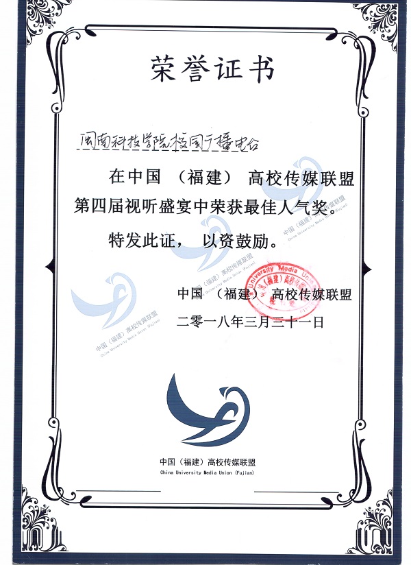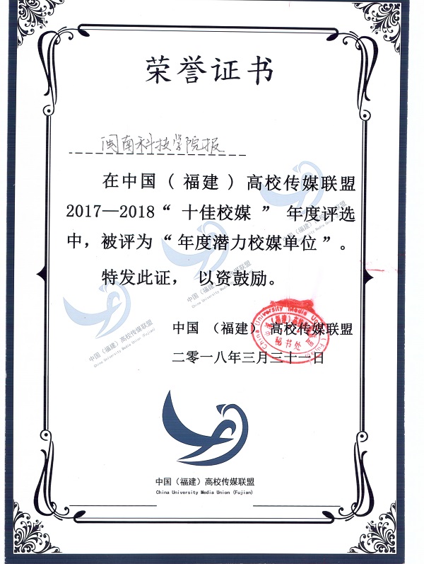 3月31日,2018中国(福建)高校传媒联盟第十届年度峰会召开,在颁奖仪式上,我院校园广播电台选送作品《疯狂动物城》影视片段配音(配音:陈启荣,黄嘉静,林家晟,姚晨心,剪辑:石冬明)获第四届“视听盛宴”二等奖和最佳人气奖,《乐鱼官方网页版报》报社获评2017-2018“十佳校媒”年度评选“年度潜力校媒单位”。