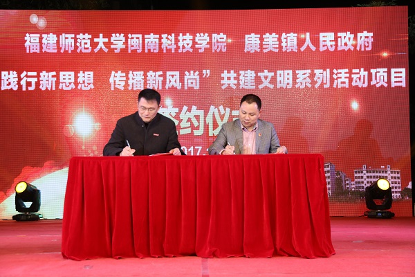 为认真贯彻落实十九大精神,深入实施文化惠民工程,丰富群众性文化生活,打造共建共治共享的社会治理格局,12月31日晚,学院与康美镇人民政府联合举办2018年元旦跨年晚会,并举行“践行新思想 传播新风尚”共建文明系列活动项目签约仪式。