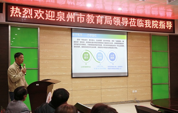 毛伟雄副局长立足习近平总书记在党的十九大报告中提出的“完善职业教育和培训体系,深化产教融合,校企合作”,全面介绍了泉州现代职业教育的基本情况、工作目标、存在的困难和问题、解决思路等内容。他指出,泉州现代职业教育以党的十九大精神为指引,努力实现五个提升,一是以完善专业建设“正负面清单”制度为导向,提升专业与产业契合度;二是以全面推进“二元”主导的现代学徒制为突破,提升人才培养与市场需求的契合度;三是以建设校企深度合作平台为载体,提升职业教育服务产业转型升级能力;四是以加快“双师型”人才队伍建设为抓手,提升职业院校核心竞争力;五是以优化区域内职业教育布局结构为重点,提升优质职业教育资源供给能力。
