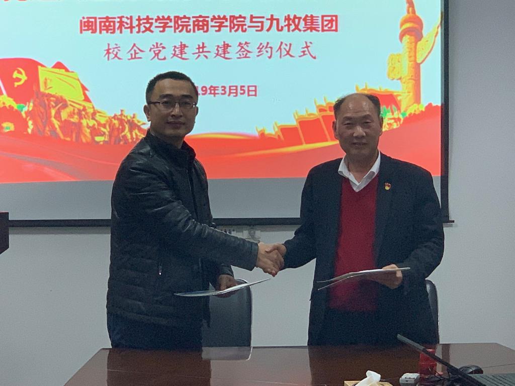 3月5日晚,商学院党总支与九牧集团有限公司党委举行校企党建共建签约仪式,商学院党总支负责人刘武强副教授,九牧集团党委委员林忠厚分别代表校企双方签订党建共建协议。