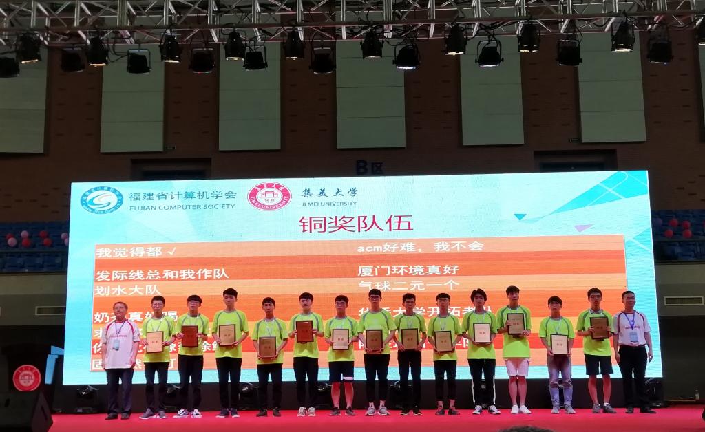 5月19日,“和信创天杯”第十届福建省大学生程序设计竞赛在集美大学举行,我院参赛队伍“ACM好难,我不会”(队员:曾志文、蔡兆坤、卓福深,教练:郑丽丽)学子获得铜奖。