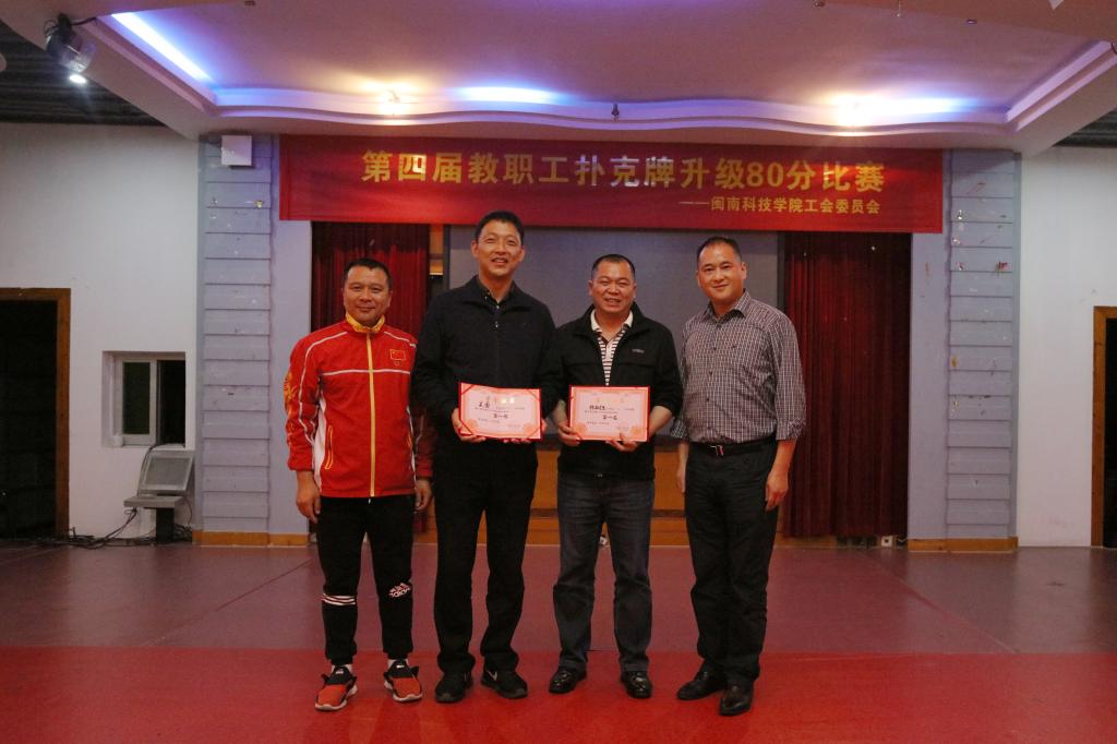 比赛采用计时积分循环,两人一组现场抽签对阵。比赛现场热烈活跃,“方块”“红桃”“黑桃”……报“主”声跌宕起伏,选手们根据自己拿牌的情况,默契配合、精确计算、步步为营。经过五轮的激烈争夺,最终吴勇和林树生两位老师组合获得比赛冠军。