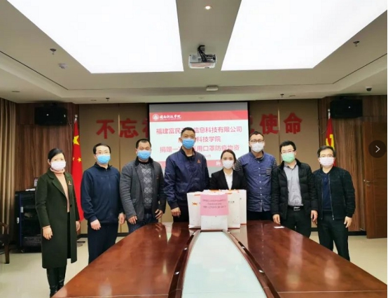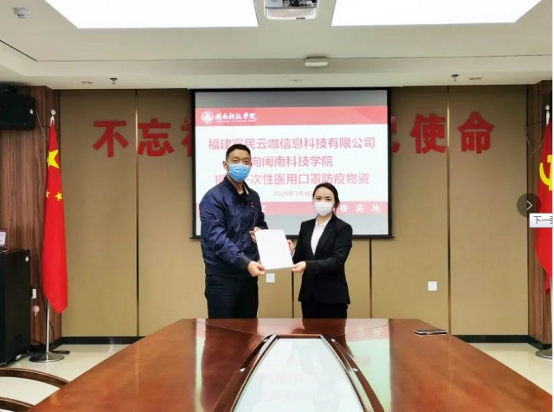 捐赠仪式上,魏丽琴副总经理向我校捐赠1000个一次性医用口罩,副校长吴勇代表学校接受防控物资捐赠,并向福建富民云咖信息科技有限公司赠送感谢信。