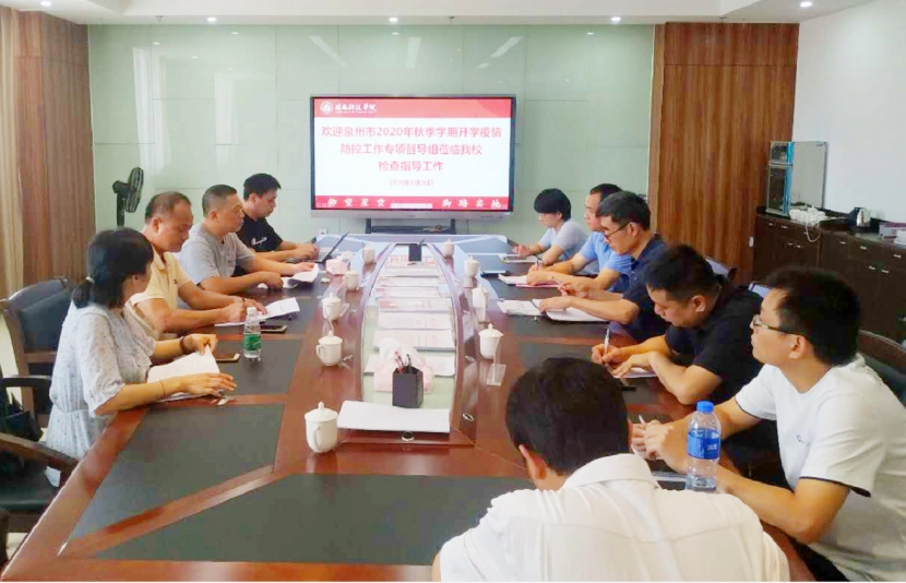 8月28日,由泉州市教育局和泉州市卫健委组成的泉州市2020年秋季学期开学疫情防控专项督导组,在泉州市教育资源配置中心主任高雄飞带领下,莅临我校检查指导工作,南安市教育局督学叶维新、体卫艺科科长周亚梅,校长游小波、常务副校长周勇军陪同检查,学校办公室、宣传部、学工处、保卫处、后勤管理处等相关职能部门负责人参加座谈会。