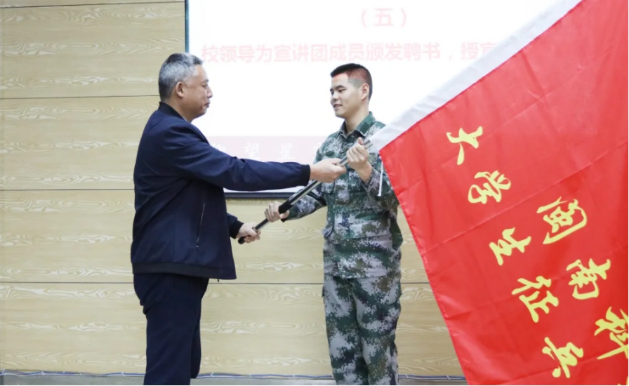 校领导李旭、林树生为入选的12名大学生征兵工作宣讲团成员颁发聘书