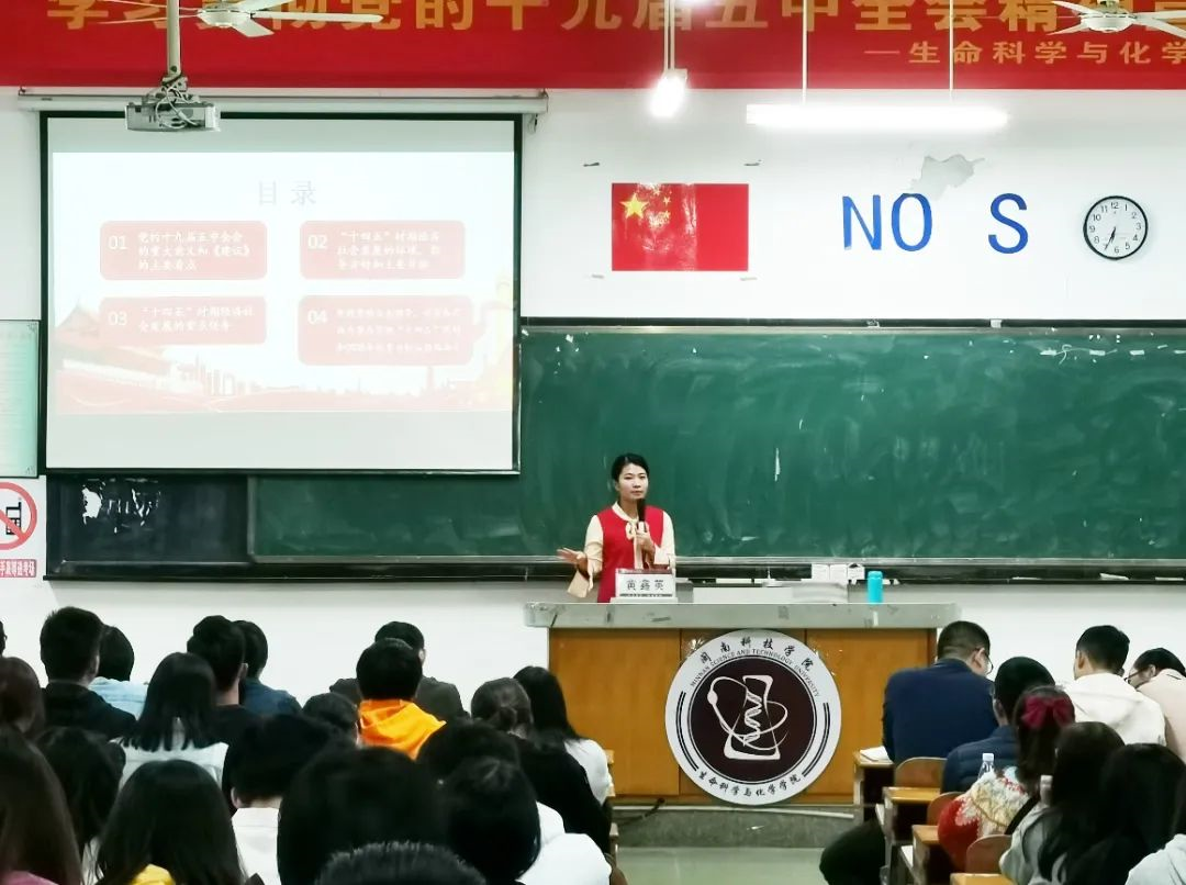 12月13日晚上,生命科学与化学学院举行学习党的十九届五中全会精神宣讲会,邀请马克思主义学院黄鑫英老师到场宣讲,生命科学与化学学院全体师生党员到场聆听。