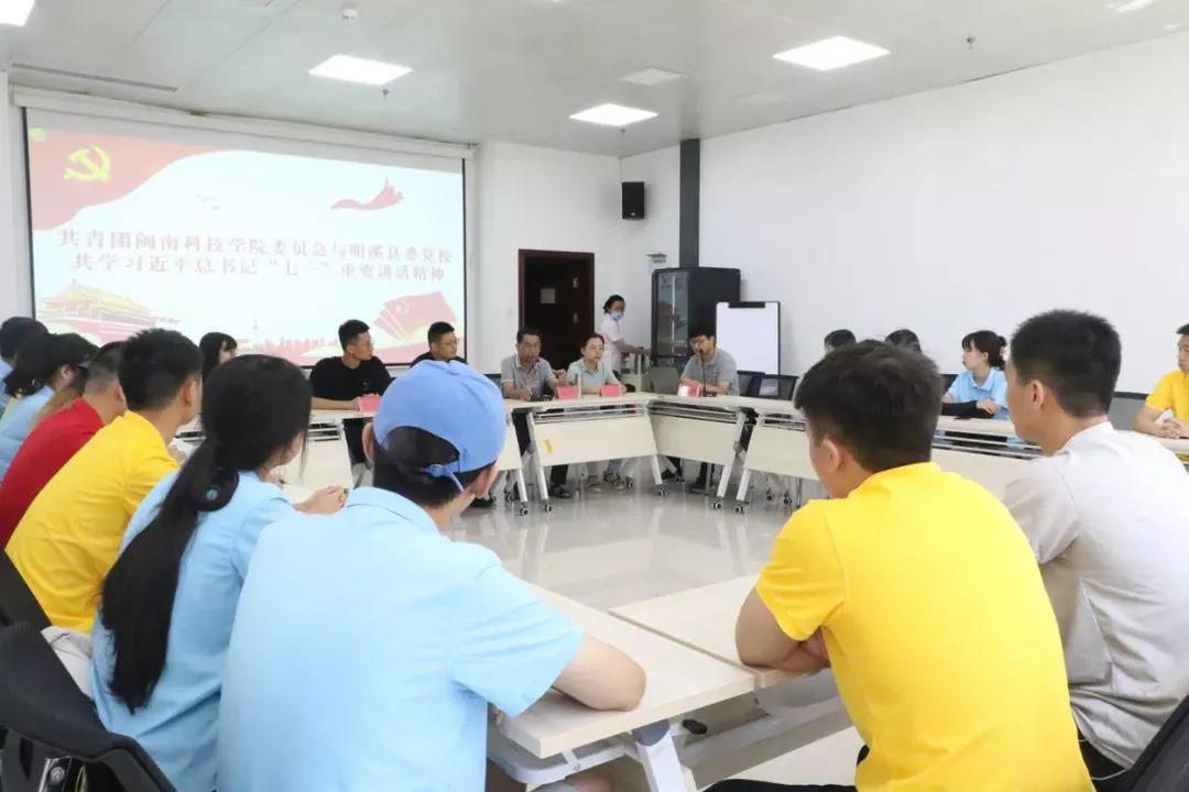 在明溪县委党校,实践队成员与党校领导、老师围坐一堂,深入学习习近平总书记在庆祝中国共产党成立100周年大会重要讲话精神。