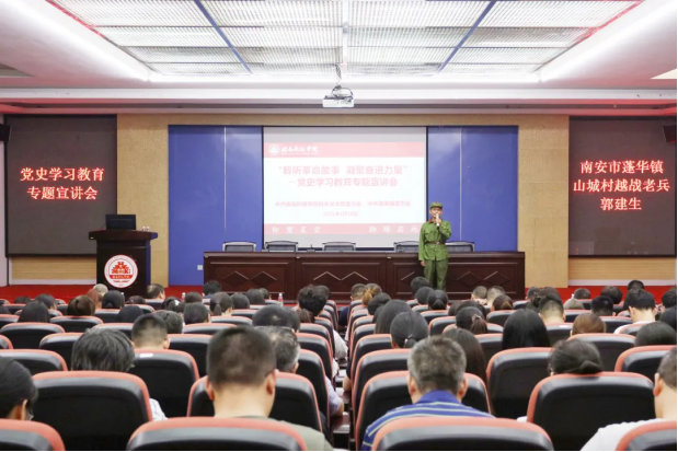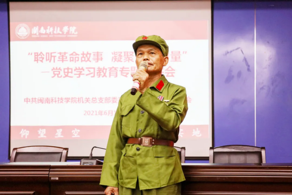 宣讲会邀请了南安市蓬华镇山城村越战老兵,泉州市爱国主义教育基地、国防教育基地讲解员郭建生老先生宣讲革命故事,重温百年党史,赓续红色精神。