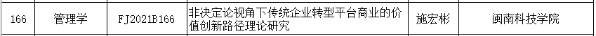 近日,2021年度福建省社会科学规划项目立项结果公布,我校商学院教授施宏彬博士主持申报的《非决定论视角下传统企业转型平台商业的价值创新路径理论研究》获一般项目立项。