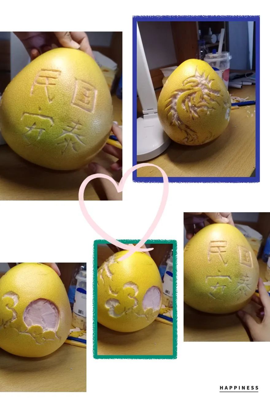 人文学院结合庆祝建党百年华诞和党史学习教育,开展“缘于‘柚’你”主题活动,活动以宿舍为单位,同学们纷纷用柚子进行创作,一刀刀,一笔笔,大家为“柚”梳妆打扮,或彰显祖国山河之壮丽,或充满青春奋进之风采,呈现出的作品形式多样、主题突出,融艺术性和思想性为一体。